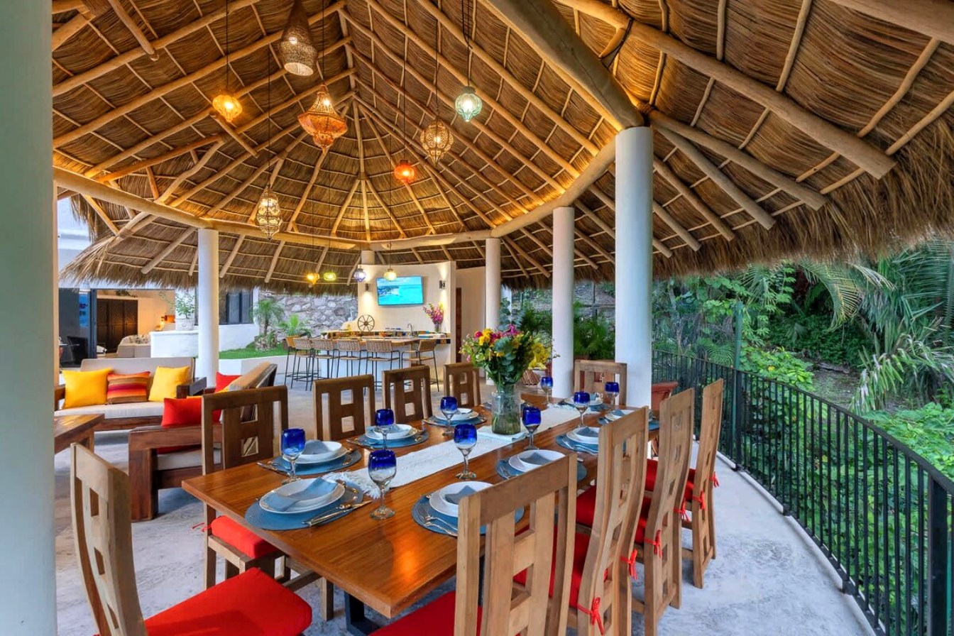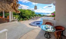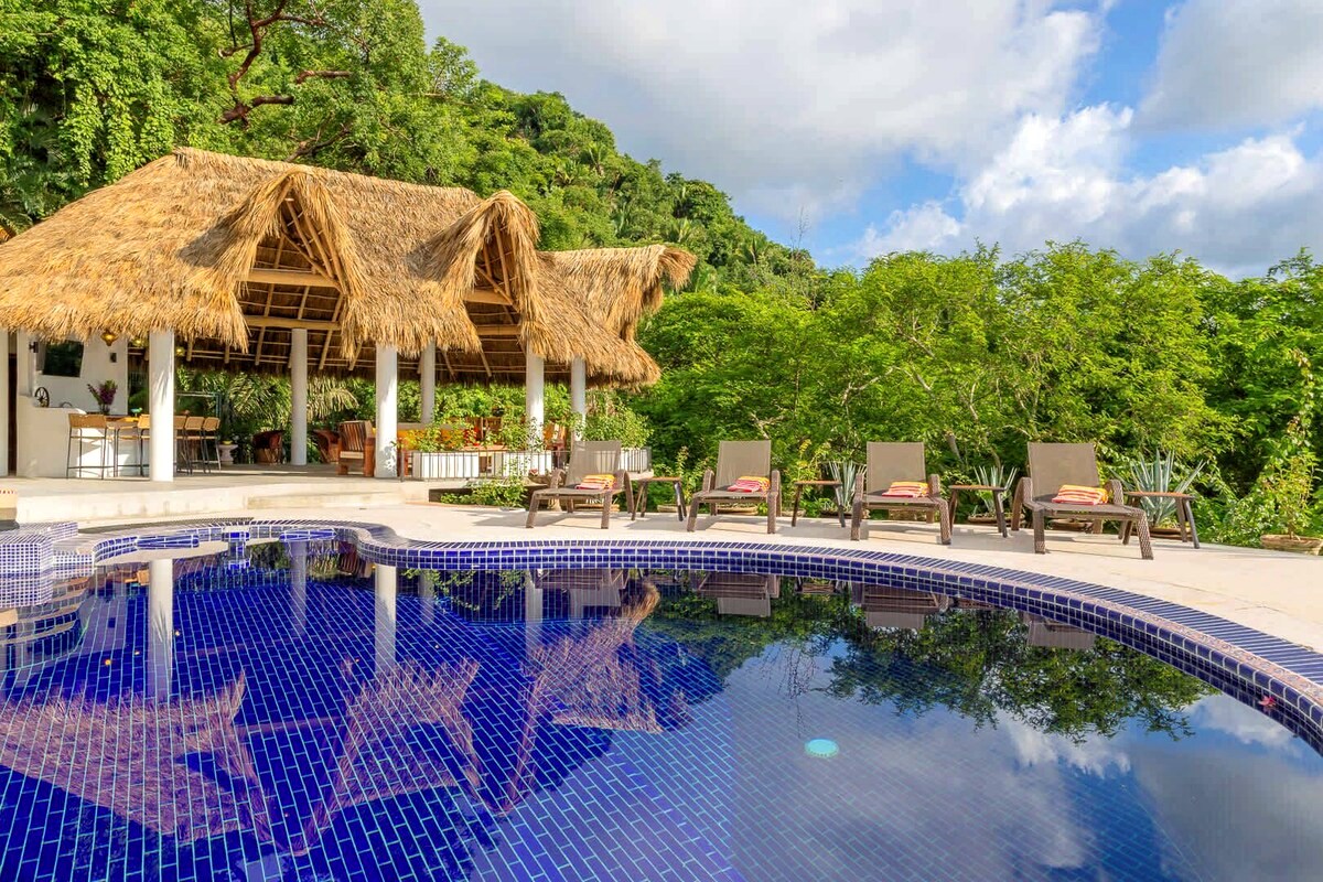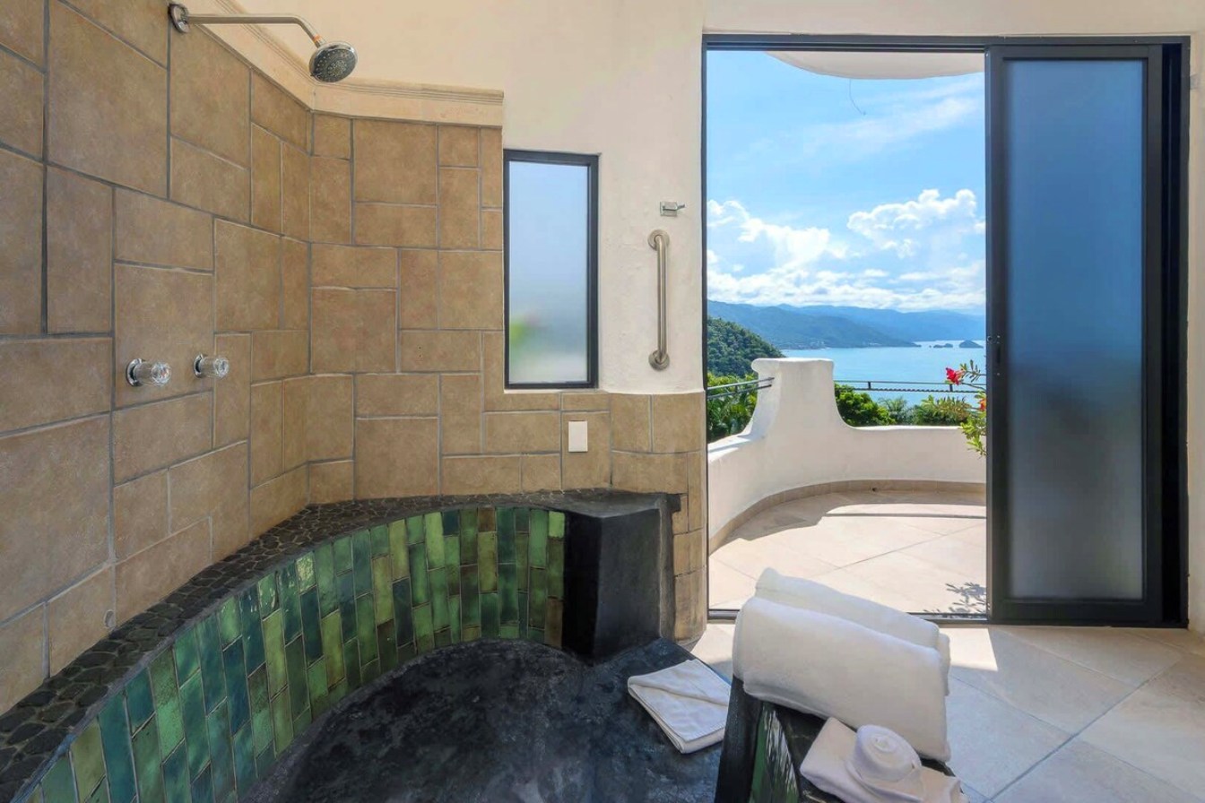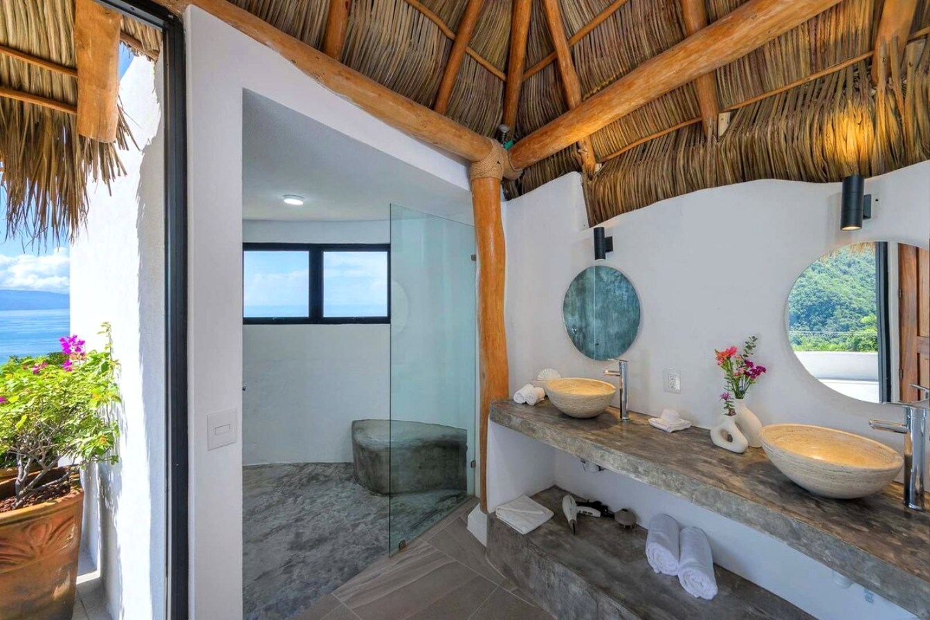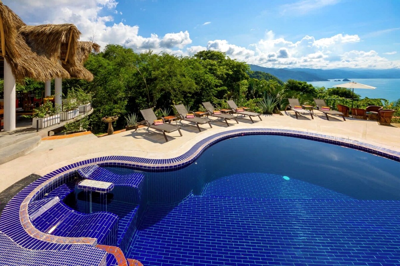 Perched on the hillside of upper Conchas Chinas, just minutes from downtown Puerto Vallarta, Villa Viaje is a luxurious retreat where contemporary design meets tropical charm. Spanning approximately 5,800 sq ft, the villa features five spacious bedrooms and five-and-a-half bathrooms, offering both inviting communal spaces and private retreats. From nearly every room, guests are treated to sweeping views of the Pacific Ocean and the Sierra Madre Mountains, creating a serene and picturesque backdrop for your stay.