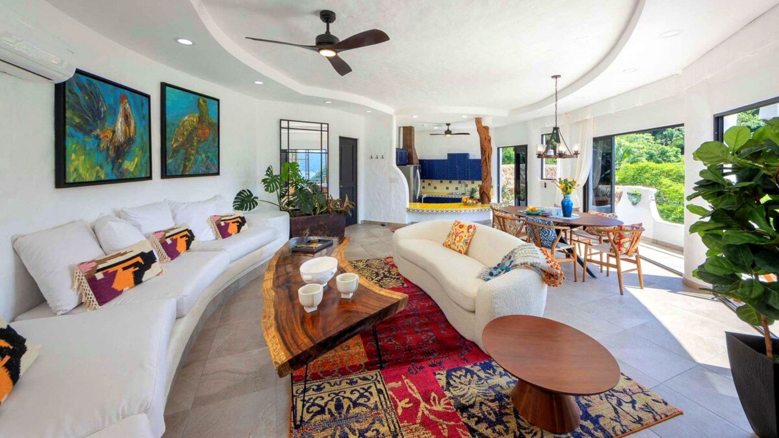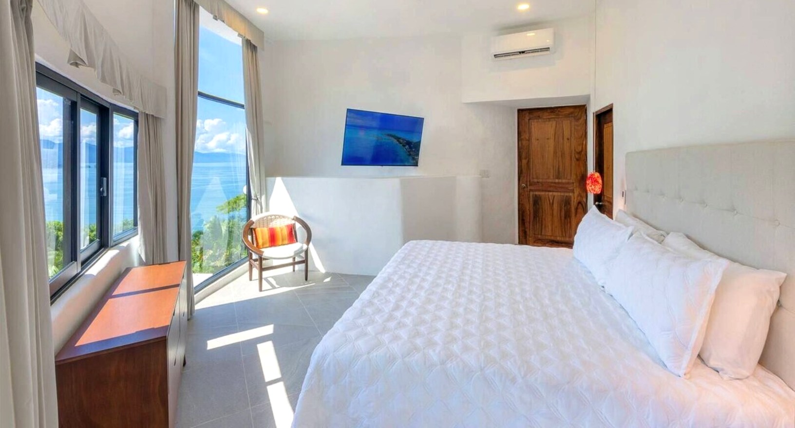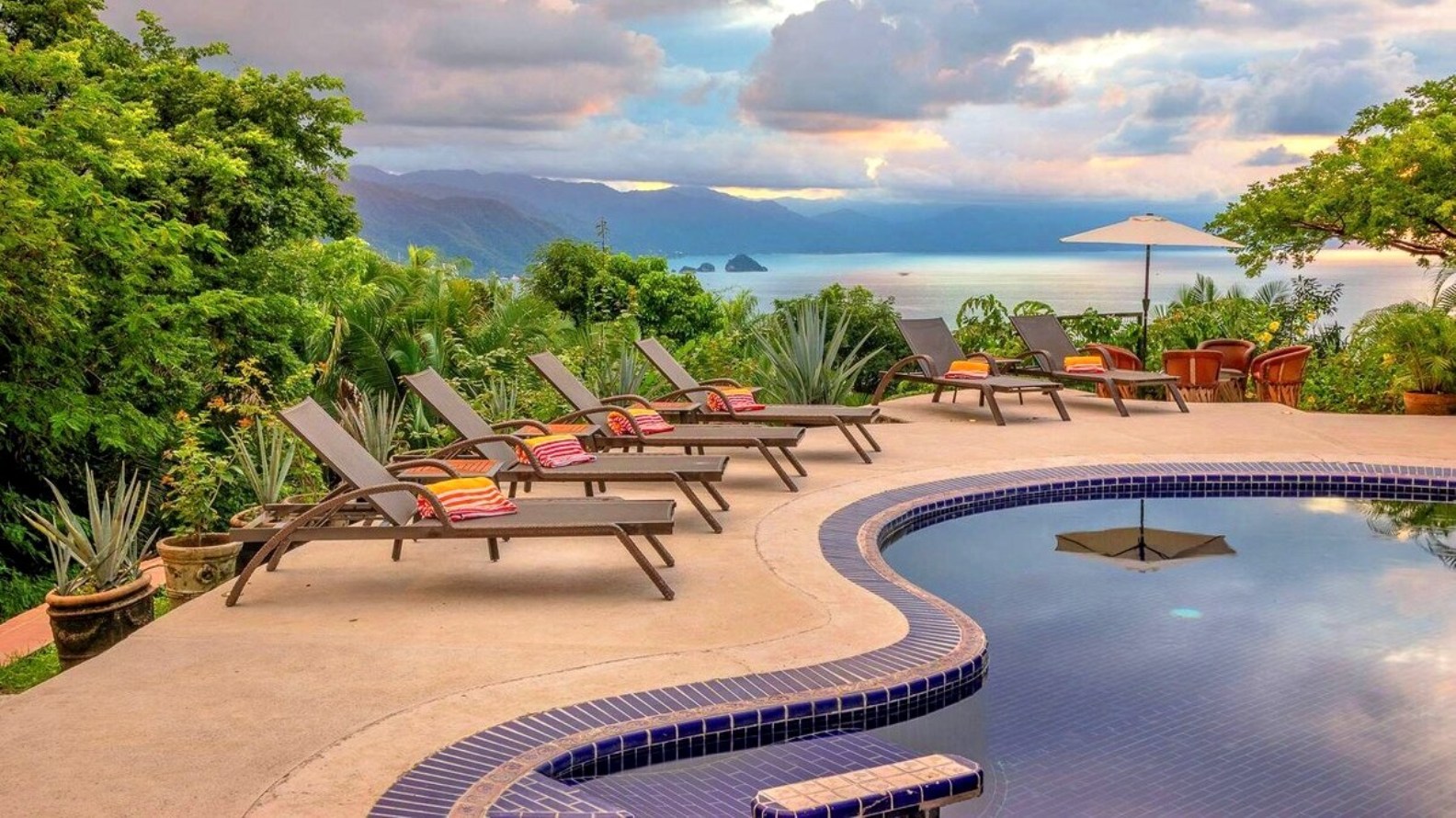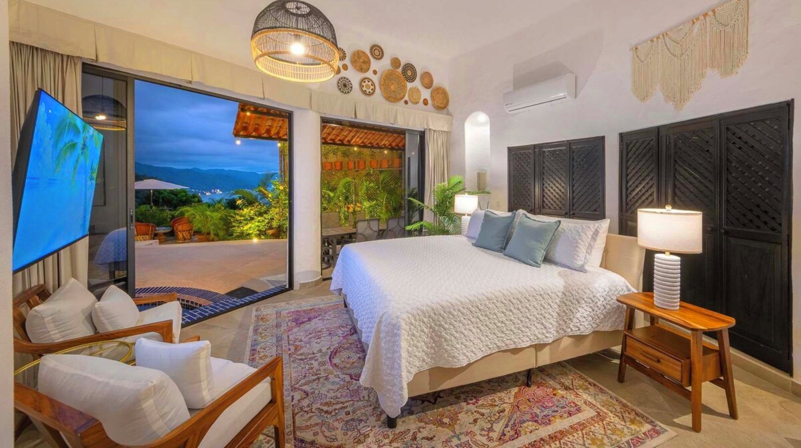 Perched on the hillside of upper Conchas Chinas, just minutes from downtown Puerto Vallarta, Villa Viaje is a luxurious retreat where contemporary design meets tropical charm. Spanning approximately 5,800 sq ft, the villa features five spacious bedrooms and five-and-a-half bathrooms, offering both inviting communal spaces and private retreats. From nearly every room, guests are treated to sweeping views of the Pacific Ocean and the Sierra Madre Mountains, creating a serene and picturesque backdrop for your stay.